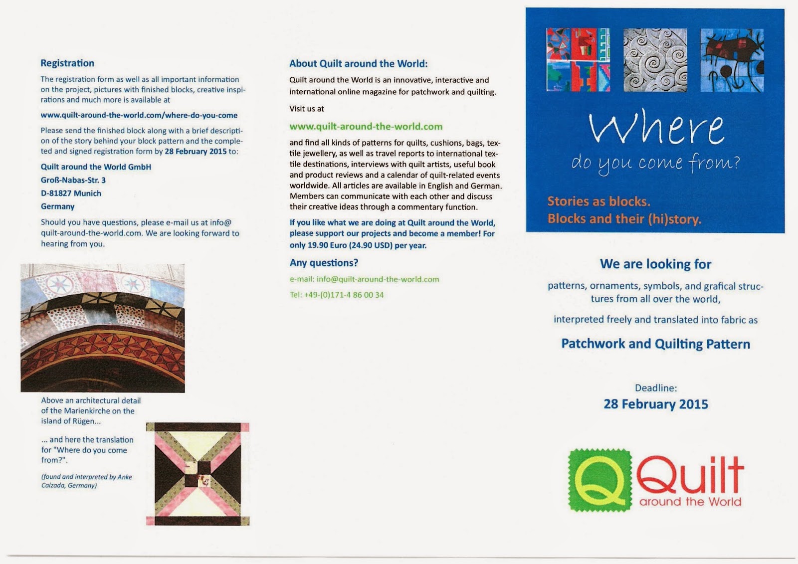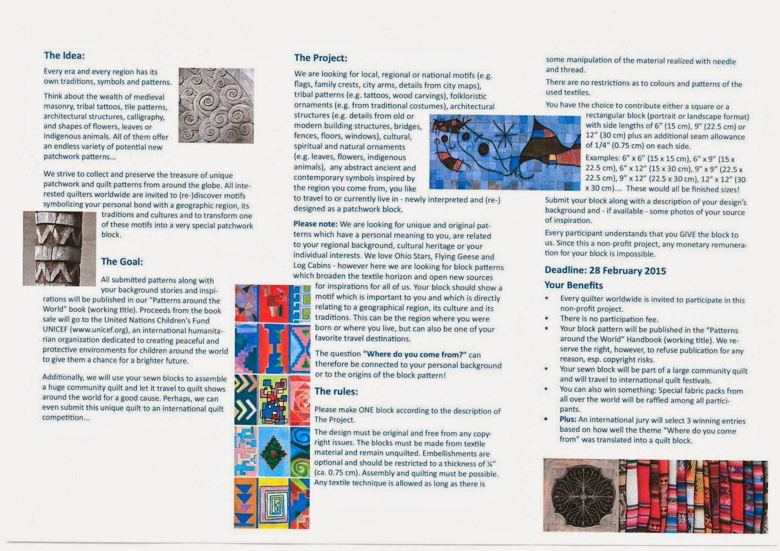 The patterns along with your background stories will be published in our “Patterns around the World” Handbook (working title). We reserve the right to refuse the publication of individual block patterns for any reason, esp. copyright risks. Proceeds from the book sale will go to UNICEF, an international humanitarian organization which works towards the goal of giving children around the world the chance for a better future.Additionally, we will use your sewn blocks to assemble a huge community quilt and let it travel to quilt shows around the world for a good cause. Perhaps, we can even submit this unique quilt to an international quilt competition...