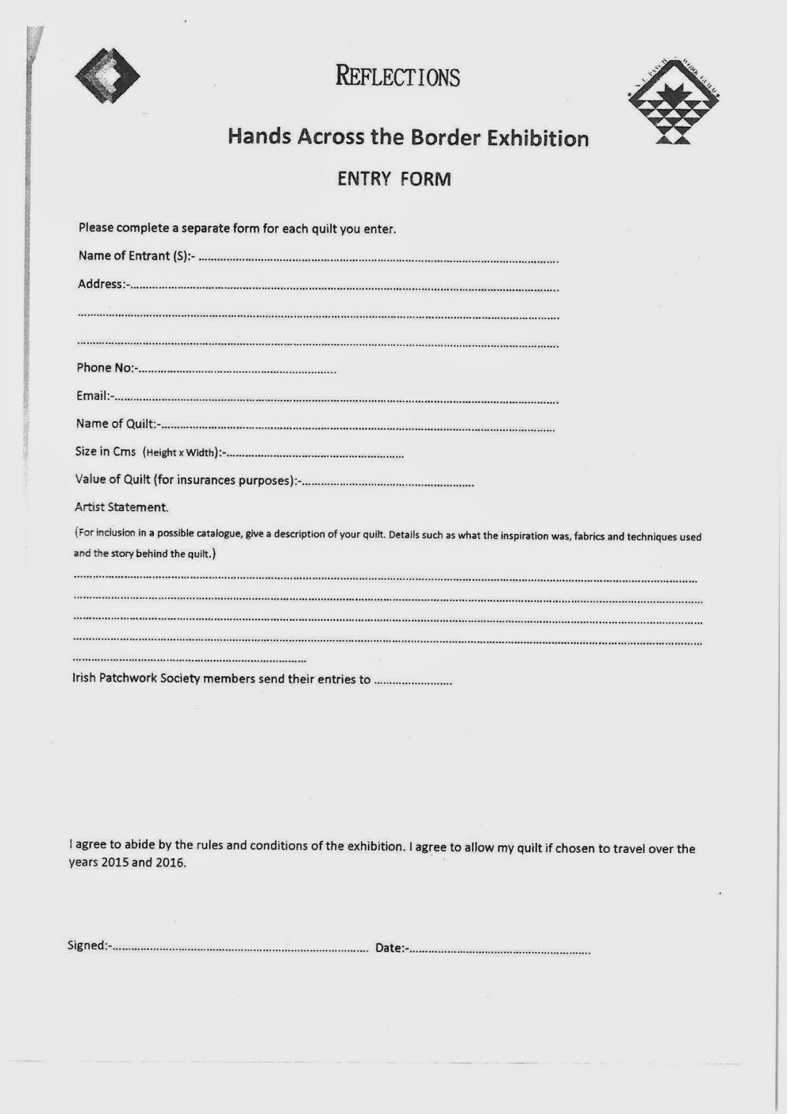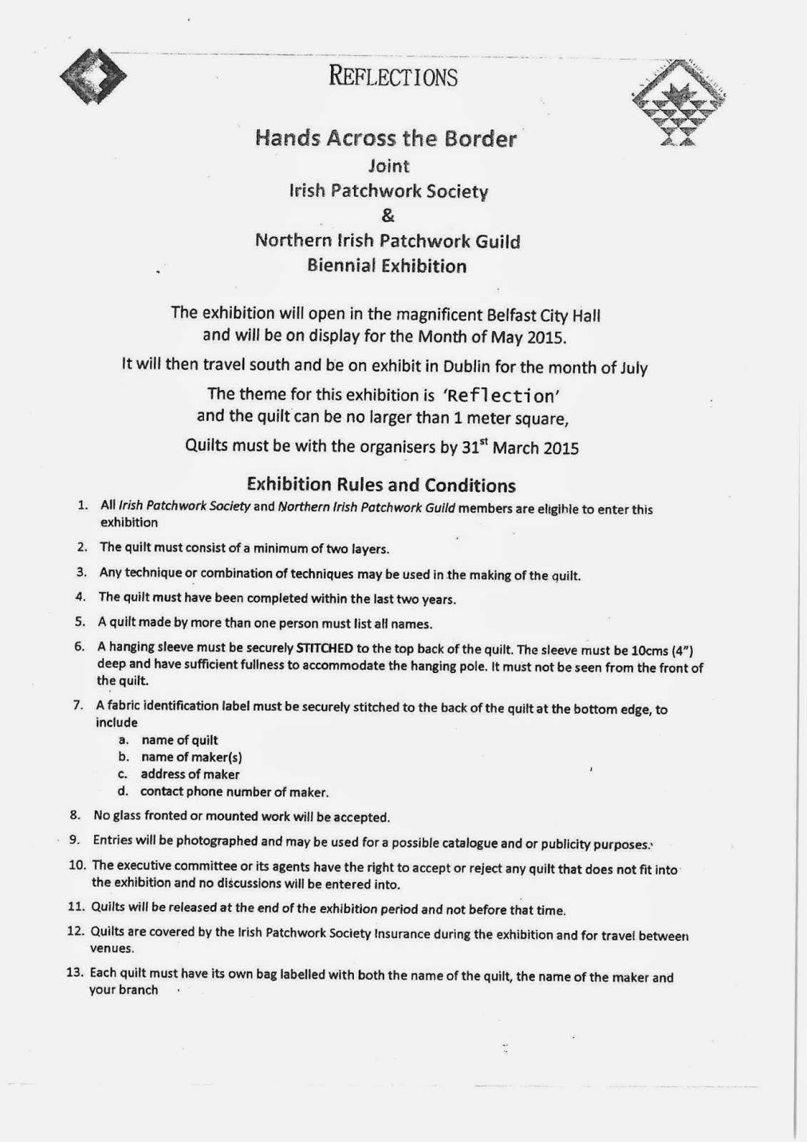 - All Irish Patchwork Society and Northern Ireland Patchwork Guild members are eligible to enter this exhibition.