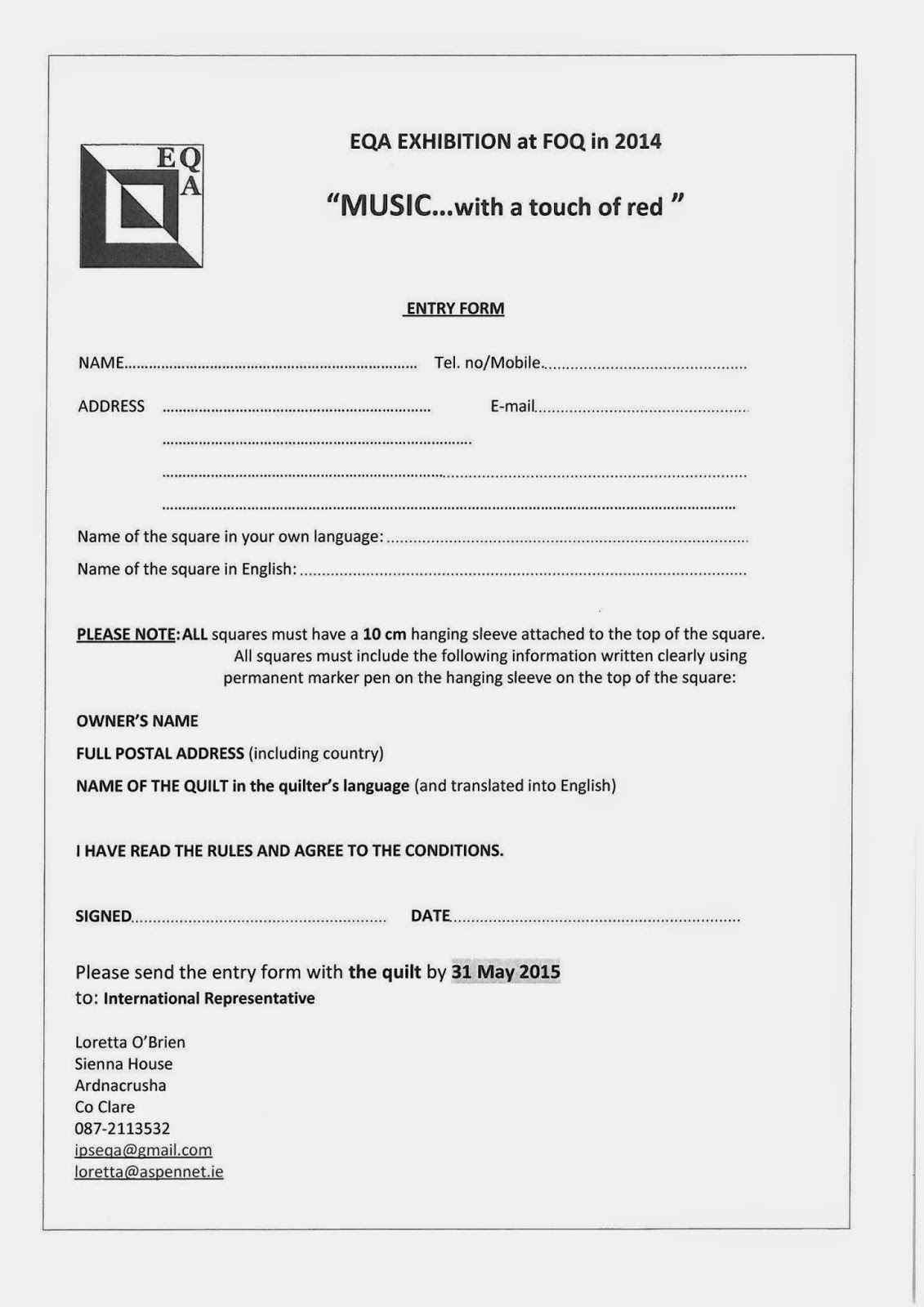 Quilts must be with the organisers by 31st March 2015 (further details to follow).